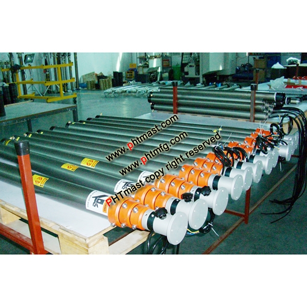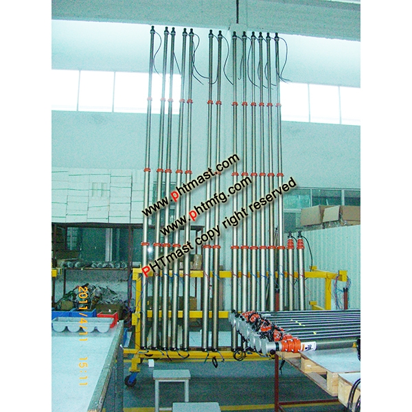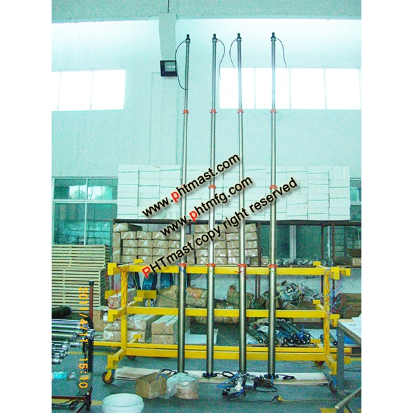 Item #: PHT-71204042 4.2m Height Portable Pneumatic Telescopic Lighting Mast 1.5m retracted height, 4x1.5 sq.mm inner cables loom. And mast can support 30kg weight lighting fixtures or others. Mast is composed of 4 sections with out diameter 43mm of top, 87mm of bottom section. mast net weight 15kg, application for portable lighting tower, security camera mounting This model we produce 200units very month for portable mobile lighting tower market homeland and abroad. they are always in stock. We send a top flange, side mounting brackets, an air hose pipe together with the mast. Every mast with accessories are packed in one carton box with 160cmL x 16cmW x 16cmH dimension, shipping weight 16kg approx.