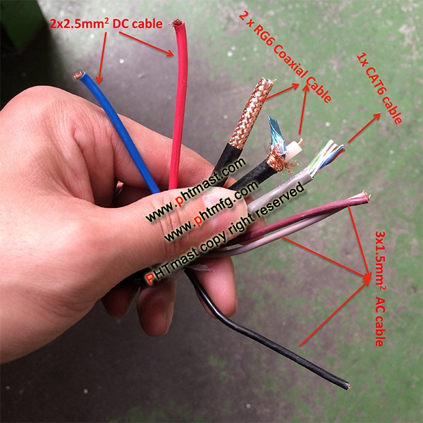 2> Internal Spiral Cables: 3x1.5sq.mm for AC Power+ 2x2.5sq.mm for DC Power + 2x RG6 Video Cable + 1x CAT5E Cable